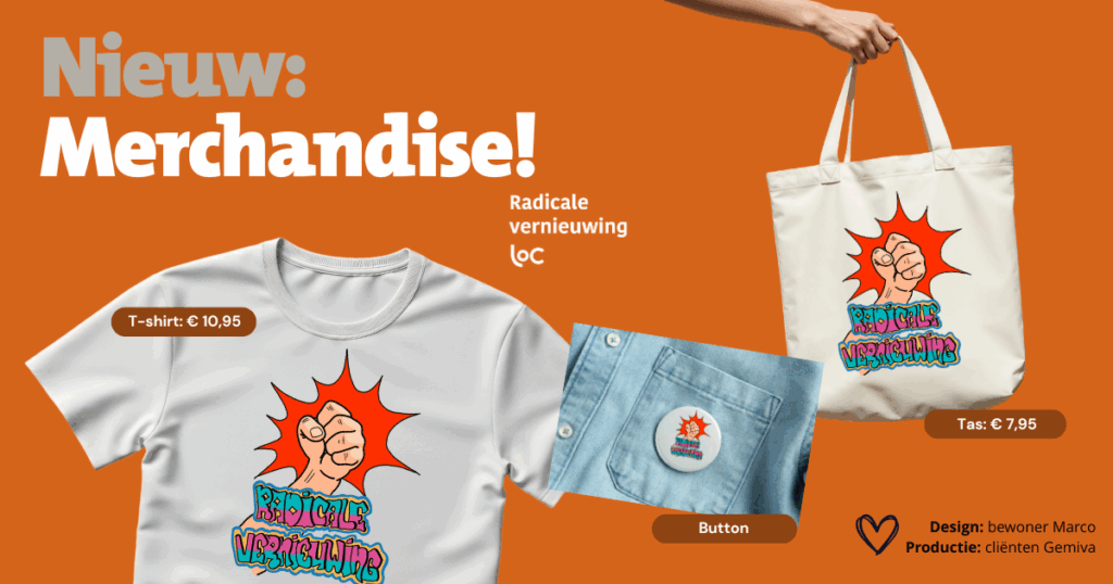 Op een van de locaties van gehandicaptenzorg-deelnemer Gemiva wordt nu merchandise gemaakt, met het logo van Radicale vernieuwing dat Marco ontworpen heeft! Dit initiatief ontstond spontaan tijdens de Halfjaarlijkse ontmoeting. Wil je ook een t-shirt, button of canvas tas met het logo, laat het graag weten via een reactie onder dit bericht. Of stuur een e-mail aan radicalevernieuwing@loc.nl of bel 030 – 207 4067.