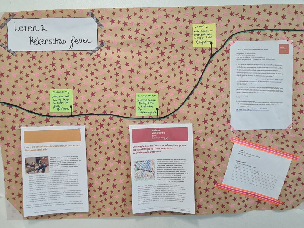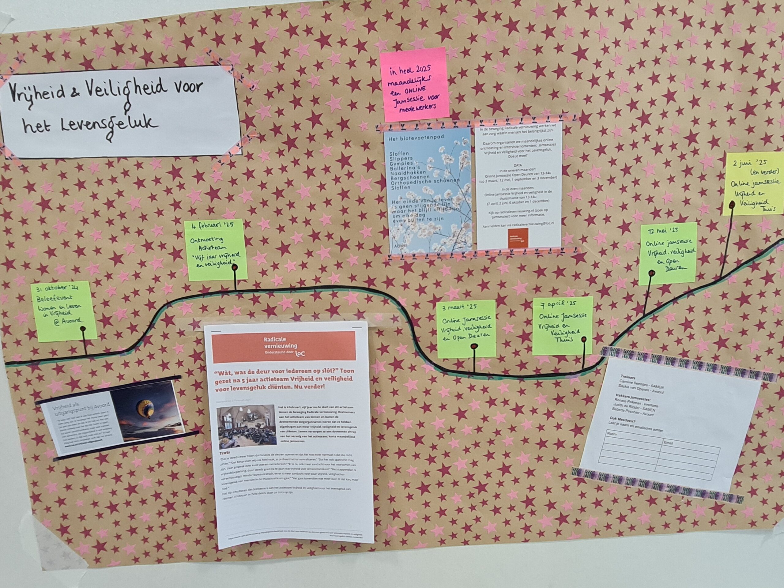 Coördinator Vera Jansweijer maakte voorafgaand aan de ontmoeting tijdlijnen van de verschillende actieteams van de beweging, die een indruk geven van de ontwikkeling die teams doormaken. Zie de foto’s hieronder (klik erop om te vergroten).
